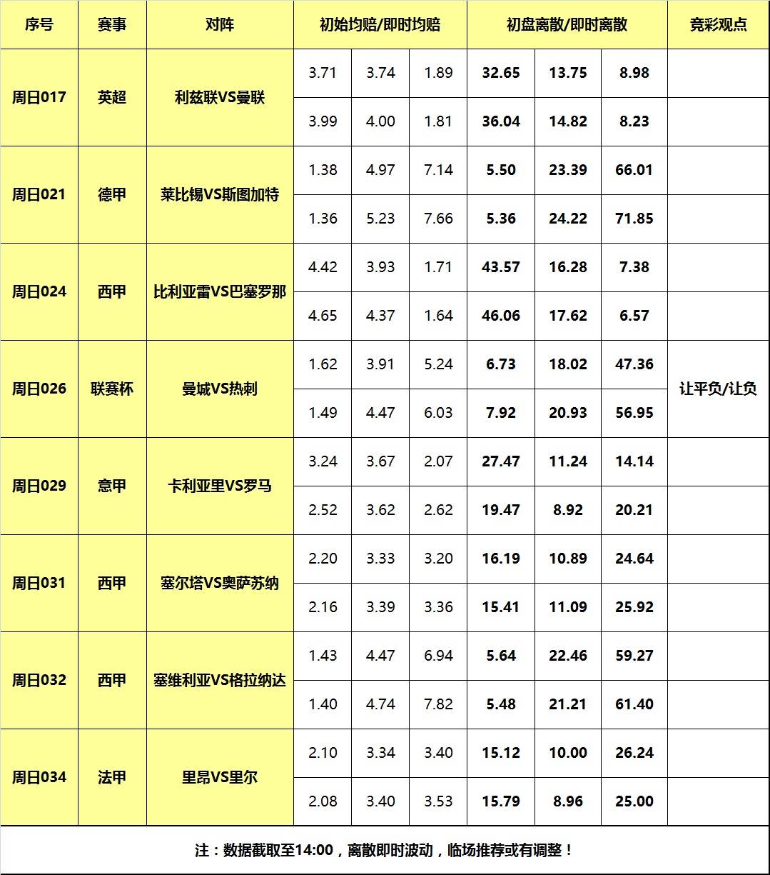 足球直播,欧洲杯直播,体育直播,球客直播,雷速体育,篮球直播,风驰直播,NBA直播,英超直播,足球比分,足球赛事,意甲,欧冠,世界杯,世界杯直播,村超,贵州村超,波胆,角球,串球,大小球[关于离散] 竞技体育分析指数,也就是各家欧指分歧度。基本原理:百家欧指平均值与每家指数差值的绝对值的求和。离散度小则各家观点接近,进而赛果易打出;离散度大反之意见分歧大,赛果不易打出。又因各方因素影响下指数变动,离散在特殊时刻具有更高参考价值,切勿盲目参考运用。换句话说,离散只是参考指数,而非结论性数据!以下是各场数据汇总(数据截取14:00):