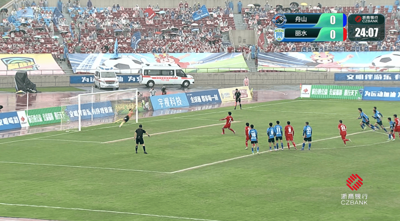上半场后半段,手握领先优势的丽水队主动加大防守强度,严密布防之下,多次成功化解舟山队的反扑攻势。补时阶段,舟山队发起猛烈冲击,险些攻破对方球门,关键时刻,丽水队门将叶京鑫挺身而出,上演精彩救险,稳住领先优势。半场结束,丽水队以1:0暂时领先舟山队。