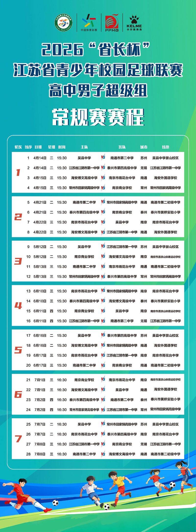 4月14日,2026“省长杯”江苏省青少年校园足球联赛高中男子超级组比赛即将打响。首场比赛为两场,分别在吴县中学与南通市第二中学,江苏省江阴市第一中学与泰兴市第四高级中学之间打响。(交汇点新闻)