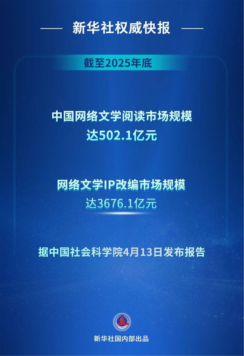 中国社会科学院4月13日在京发布的《2025中国网络文学发展研究报告》显示,截至2025年底,中国网络文学阅读市场规模达502.1亿元,同比增长16.6%;网络文学IP改编市场规模达3676.1亿元,同比增长23.13%。(新华社)