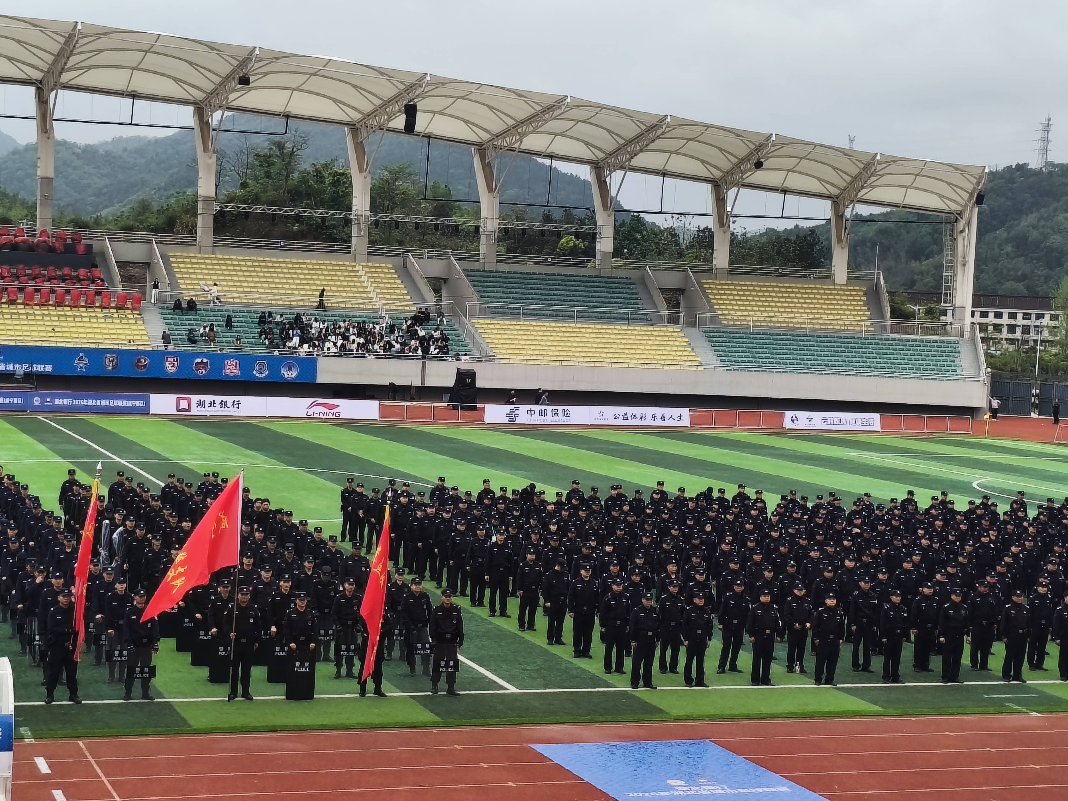 4月15日下午,崇阳县体育馆内,誓言铿锵。来自市县两级的公安民辅警、保安及志愿者骨干整齐列阵,“楚超”咸宁赛区安保实战演练暨誓师大会在这里举行。