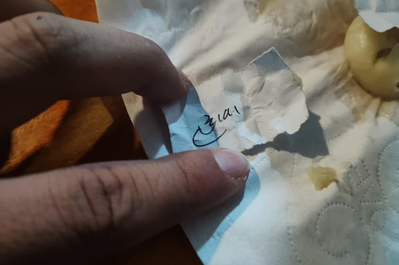 李民庆:跟我们内地的面疙瘩有点像,用藏语写的小纸条放在里面。我吃到的一个,写的是“月亮”。阿佳(藏语“姐姐”)说,那代表“善良”。