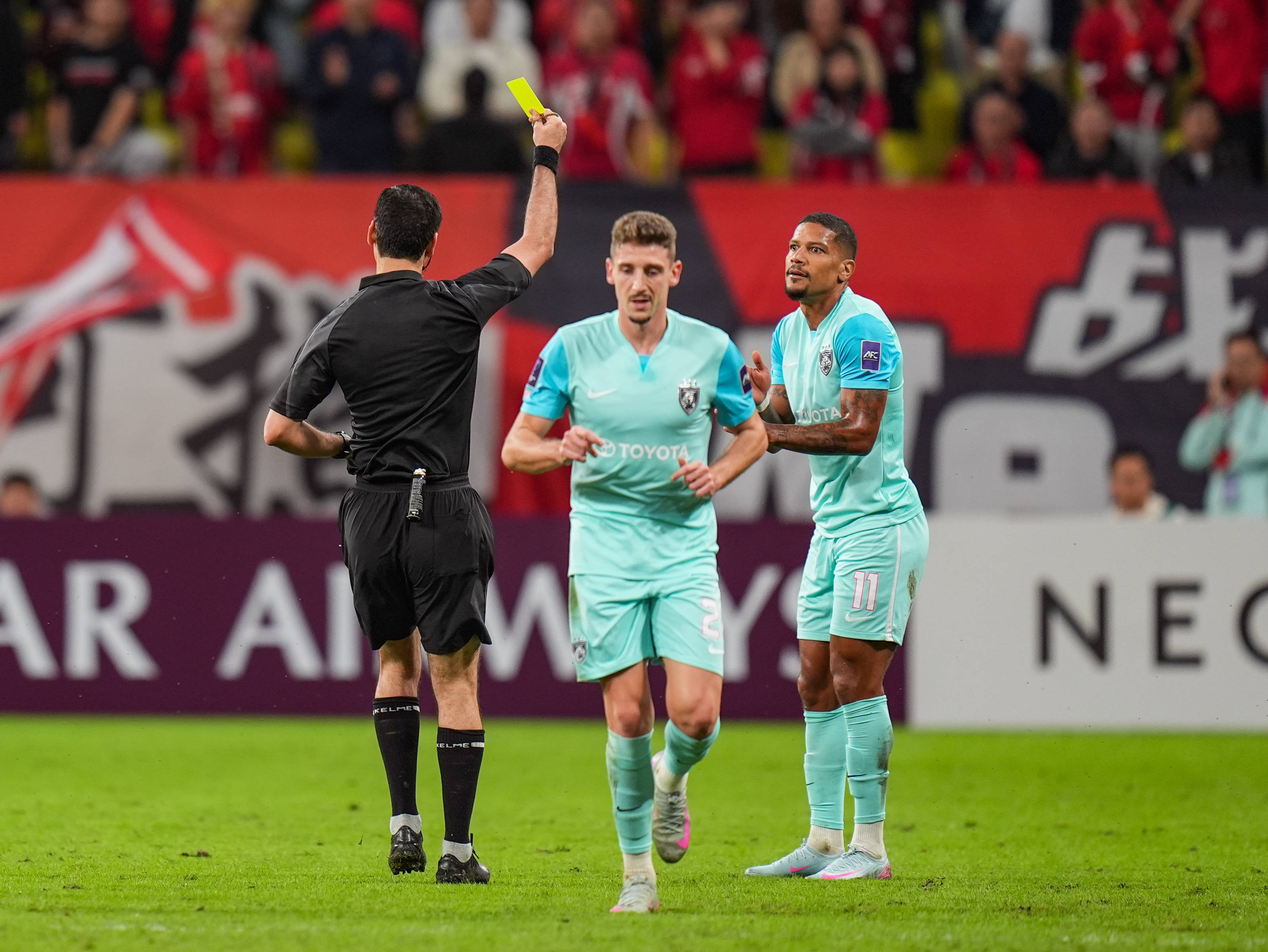 10月21日,主裁判向马来西亚柔佛新山队球员雅伊罗(右)出示黄牌。 新华社记者 王曦 摄