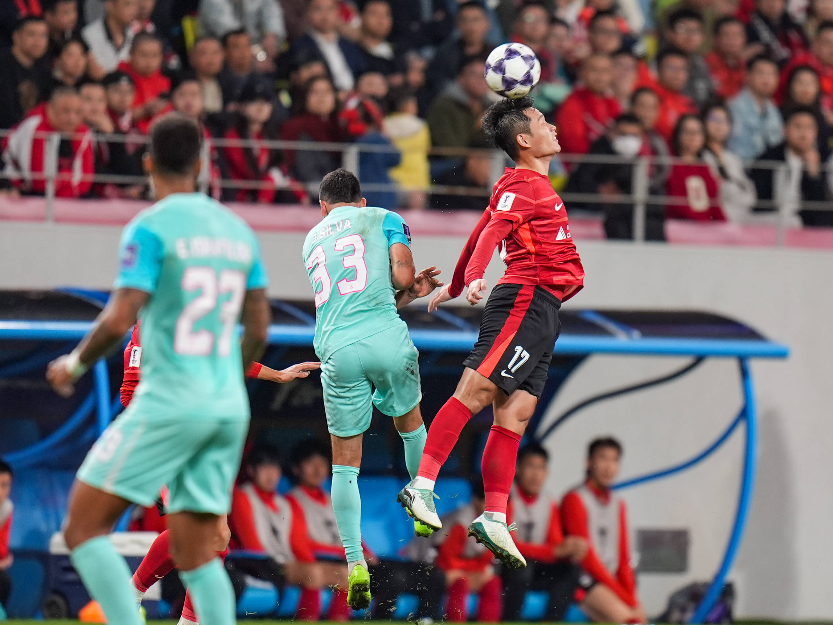 10月21日,成都蓉城队球员费利佩(上左)在比赛中争顶。 新华社记者 王曦 摄